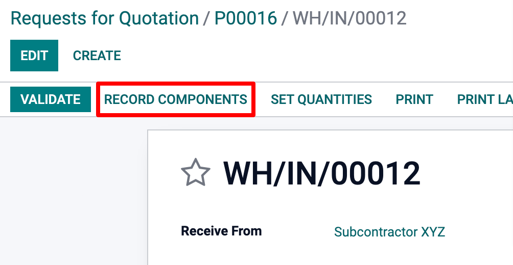 In that case, on the receipt of the subcontracted product, a Record Components button appears. Click on it to open a dialog box and record the serial/lot numbers of the components. If the finished product is also tracked, its serial/lot number can be registered here too.