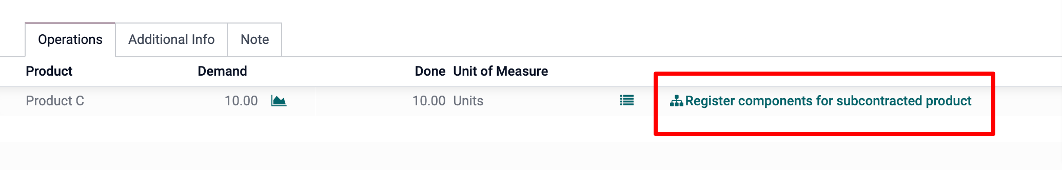 Also note that in case flexible consumption has been selected on the subcontracted BOM for a non-tracked product, the record components option will also appear optionally on each move line, if you want to register more or less component consumption at your subcontracting location, when receiving your final product.