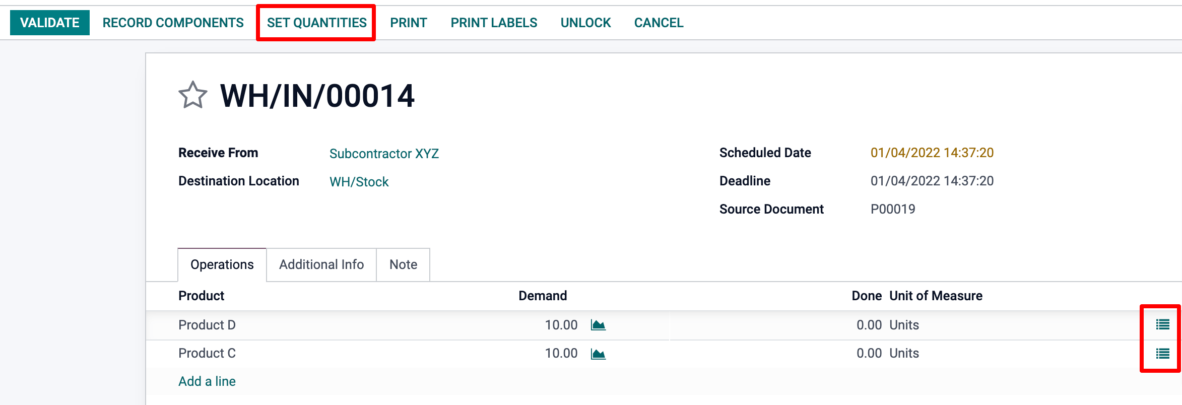 As you can see, the reception of both of these non-tracked products can either be executed by selecting the ‘Set Quantities’ Option or via the move line hamburger menus.
