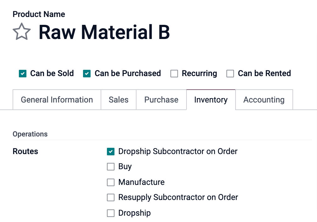 To define if a product must be subcontracted, use a Bill of Materials (BoM) of type Subcontracting.
