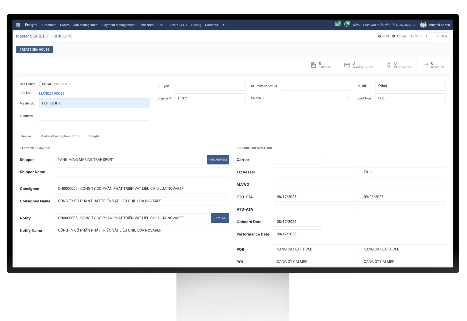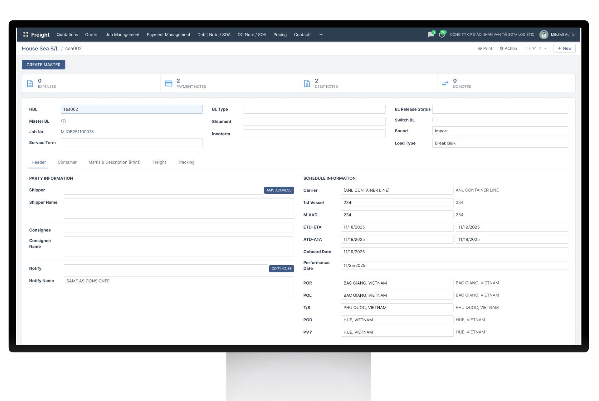 Automated Debit/Credit Notes linked with Jobs and House/Master B/Ls.
