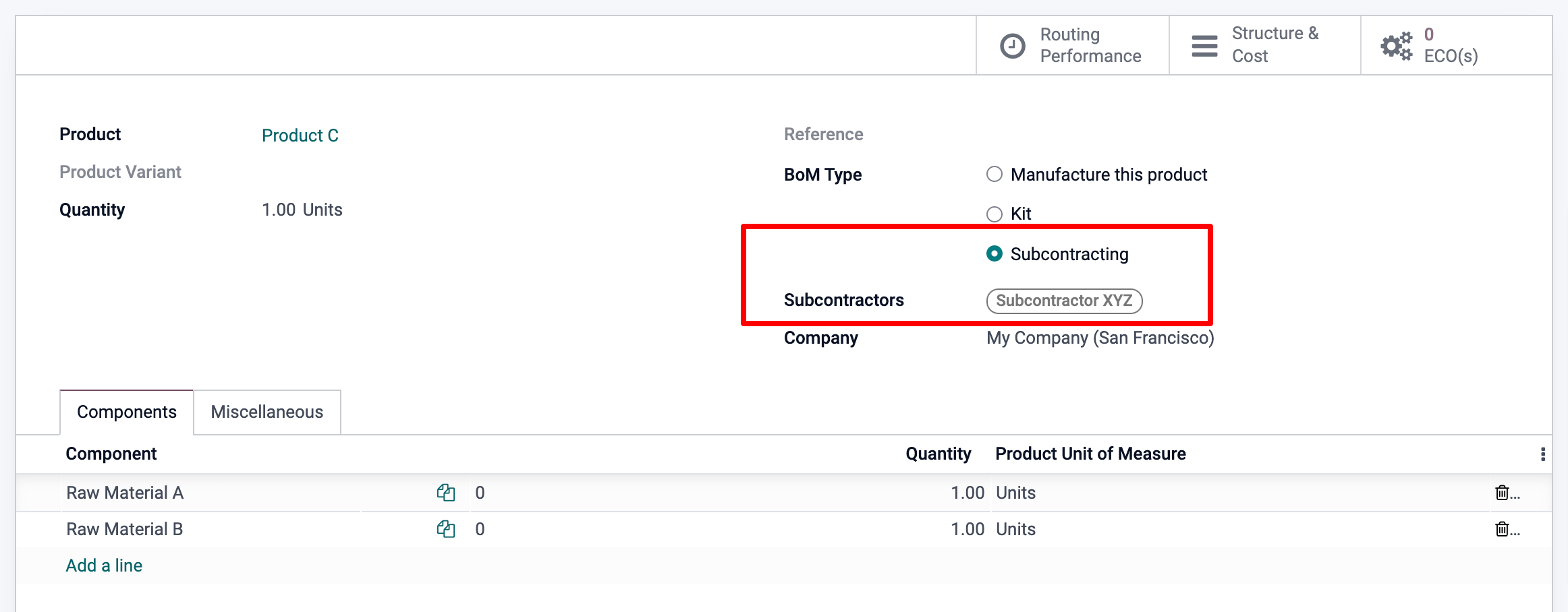 Once you have set the BoM Type to Subcontracting, specify one or several subcontractors.