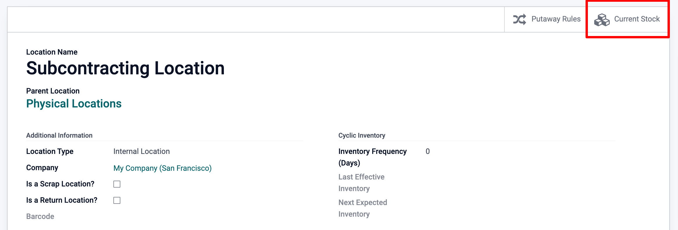 From the location form, you are then able to access the Current Stock.